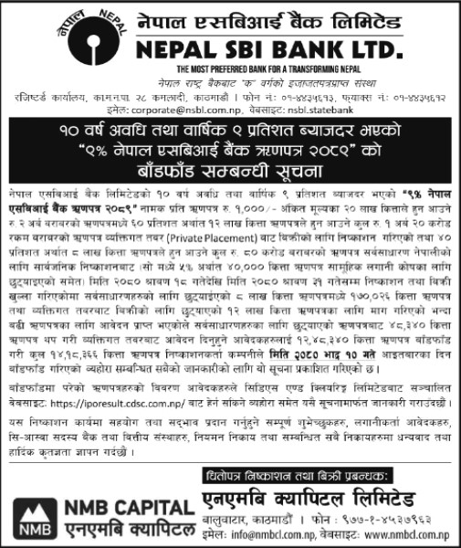 ९ प्रतिशत ब्याजदर भएको नेपाल एसबिआई बैंक ऋणपत्र २०८९ को बाँडफाँड सम्पन्न