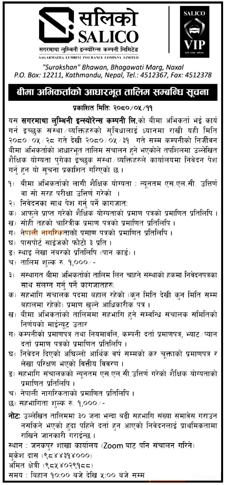 कम्पनीले भदौ २८ गतेदेखि ३१ गतेसम्म निर्जीवन बीमा अभिकर्ताको आभारभूत तालिम सञ्चालन गर्न लागेको हो । न्यूनतम एसएलसी वा सो सरहको परीक्षा उत्तीर्ण गरेकाले तालिममा सहगभागी हुन सक्ने कम्पनीले बताएको छ ।