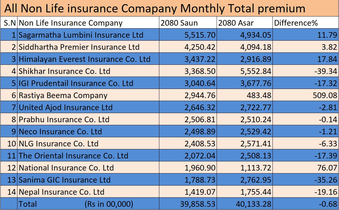 साउन महिनामा सगरमाथा लुम्बिनी इन्स्योरेन्सको छलाङ, गत वर्षको तुलनामा प्रभु इन्स्योरेन्सको उल्लेख्य प्रगति