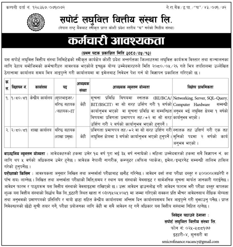 सपोर्ट लघुवित्तद्वारा कर्मचारी माग, कति चाहिन्छ शैक्षिक योग्यता ?