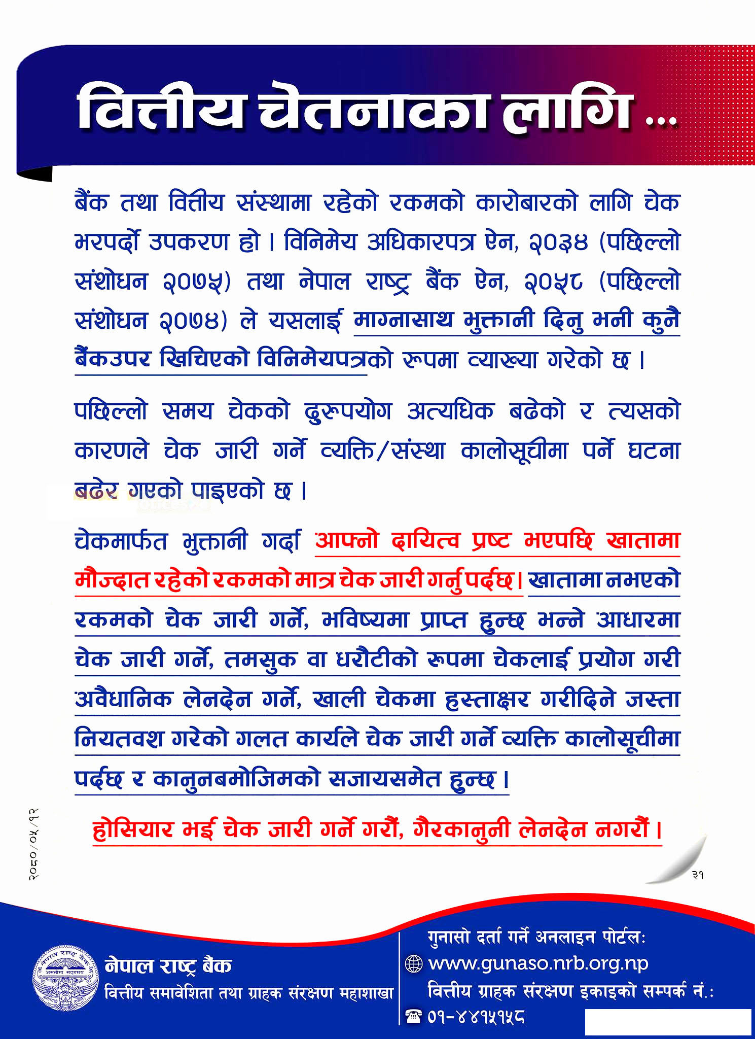 काठमाडौं । पछिल्लो समय चेकको दुरुपयोग अत्याधिक मात्रामा बढ्न थालेपछि त्यसको न्यूनिकरण तथा सचेतनाका लागि राष्ट्र बैंकले सूचना जारी गरेको हो ।