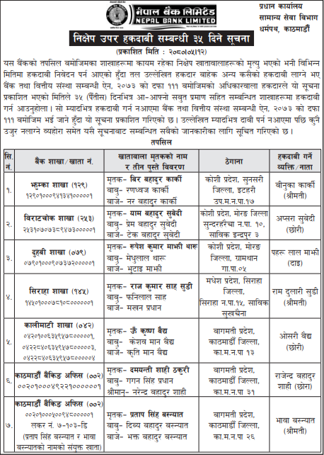 काठमाडौं । नेपाल बैंक लिमिटेडको उल्लेखित शाखाहरुमा कायम रहेको निक्षेप खातावालाहरुको मृत्यु भएको भनी विभिन्न मितिमा हकदाबी निवेदन पर्न आएपछि तपशिलका हकदार बाहेक अन्य कसैको हकदाबी लाग्ने भए हकदाबी गर्न बैंकले सूचना निकालेको हो ।