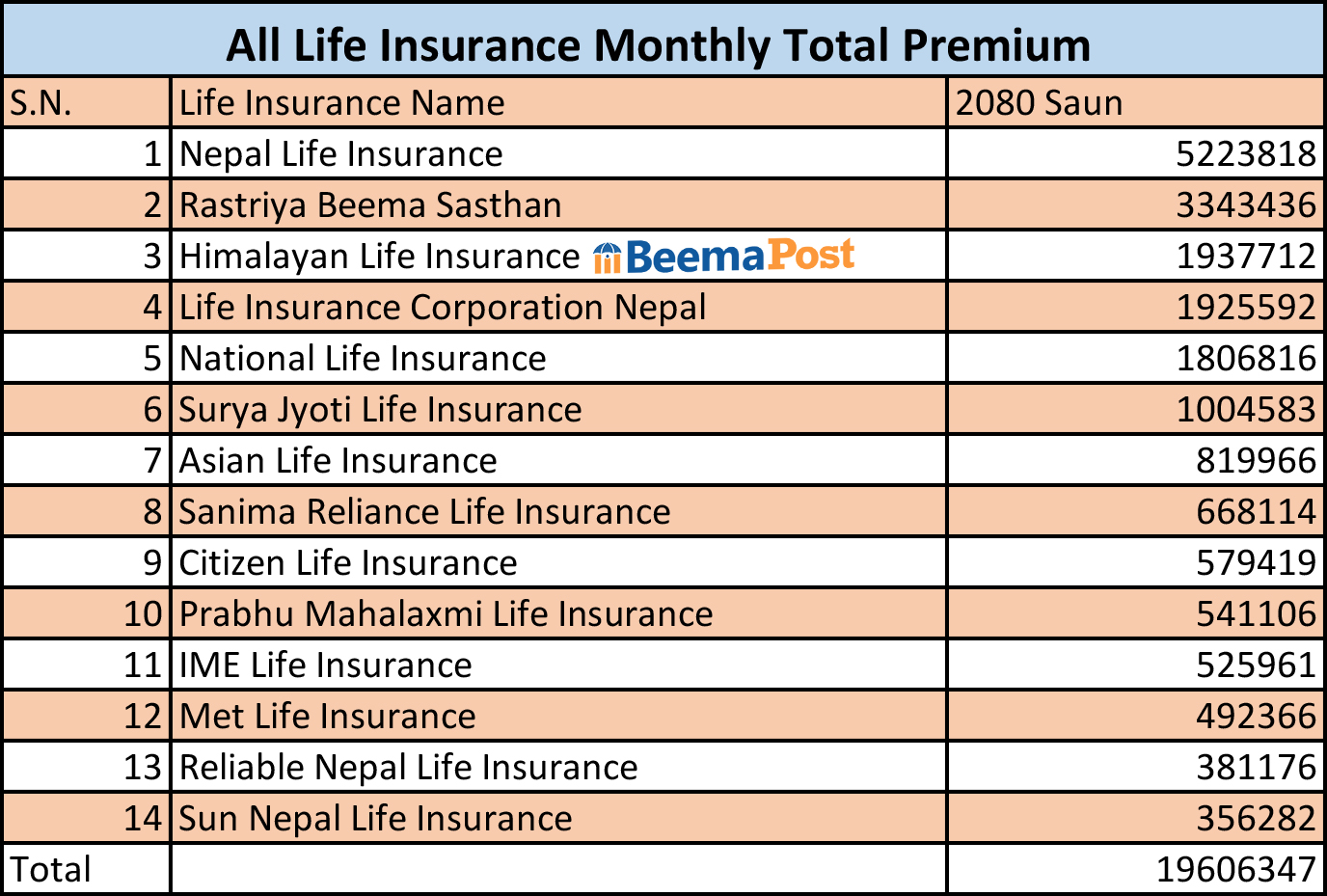 बीमा प्राधिकरणको तथ्यांक अनुसार एलआइसी नेपालले १ अर्ब ९२ करोड रुपैयाँ, नेशनल लाइफ इनस्योरेन्स कम्पनीले १ अर्ब ८० करोड रुपैयाँ, सूर्यज्योति लाइफले १ अर्ब एशियन लाइफ इन्स्योरेन्सले ८१ करोड ९९ लाख रुपैयाँ सानिमा रिलायन्स लाइफले ६६ करोड ८१ लाख रुपैयाँ, सिटिजन लाइफले ५७ करोड ९४लाख रुपैयाँ, प्रभु महालक्ष्मी लाइफले ५४ करोड ११ लाख रुपैयाँ, आइएमई लाइफले ५२ करोड ५९ लाख रुपैयाँ, मेट लाइफले ४९ करोड २३ लाख रुपैयाँ, रिलायबल नेपाल लाइफले ३८ करोड ११ लाख रुपैयाँ र सन नेपाल लाइफले ३५ करोड ६२ लाख रुपैयाँ कुल बीमा शुल्क आर्जन गरेको छ ।