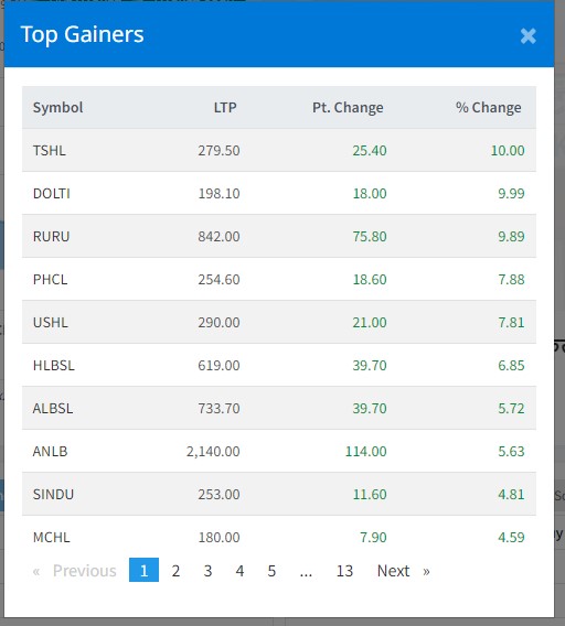 त्यस्तै, आत्म निर्भर लघुवित्तको शेयर मूल्य ५.६३ प्रतिशतले बृद्धि हुँदा सिन्धु विकास बैंक र मेन्छियाम हाईड्रोपावर कम्पनी आजका टप १० कम्पनीमा पर्न सफल भएका छन् । आज कूल १३० वटा कम्पनीको शेयर मूल्य बृद्धि भएको छ ।