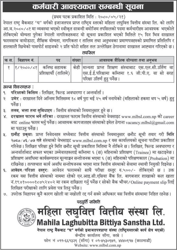 काठमाडौं । महिला लघुवित्त वित्तीय संस्था लिमिटेडले कनिष्ठ सहायक प्रशिक्षार्थी पदमा आवेदन माग गरेको छ ।