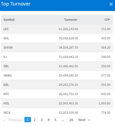त्यस्तै, सोल्टि होटल, शिवम सिमेन्टस, आइएमई लाइफ, सिद्धार्थ बैंक, नबिल बैंक, एभरेष्ट बैंक, एनटिसी, हिमालयन डिष्टलरी र एनआईसी एशिया बैंैकको सर्वाधिक कारोबार भएको छ ।