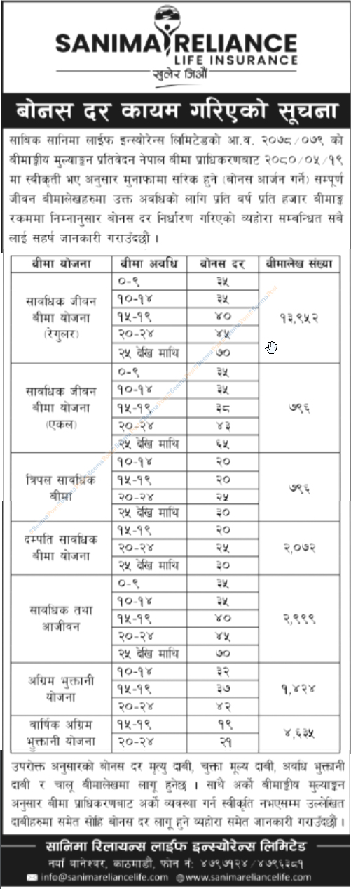 यसका साथै कम्पनीले त्रिपल सावधिक बीमा योजनामा प्रतिहजार २० रुपैयाँदेखि ३०रुपैयाँ, दम्पति सावधिक बीमा योजनामा प्रतिहजार २० रुपैयाँदेखि ३० रुपैयाँ, सावधिक तथा आजीवन बीमालेखमा प्रतिहजार ३५ रुपैयाँदेखि ७० रुपैयाँ, अग्रिम भुक्तानी योजनामा प्रतिहजार ३२ रुपैयाँदेखि ४२ रुपैयाँ र वार्षिक अग्रिम भुक्तानी योजनामा न्युनतम प्रतिहजार १९रुपैयाँदेखि २१ रुपैयाँ सम्म बोनसदर कायम गरेको छ ।