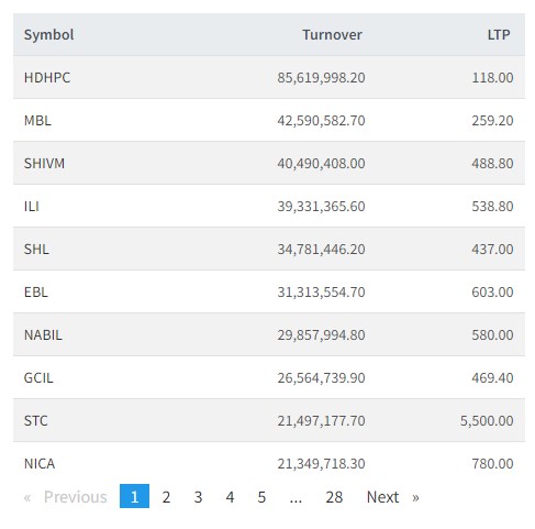 त्यस्तै, शिवम सिमेन्टस, माछापुच्छे्र बैंक, आइएमई लाइफ, सोल्टि होटल, एभरेष्ट बैंक, नबिल बैंक, घोराही सिमेन्टस, हिमालयन डिष्टिलरी र साल्ट टेडिङको सर्वाधिक कारोबार भएको छ ।