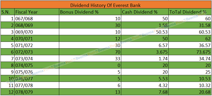 समीक्षा अवधिसम्म बैंकहरुको लाभांश इतिहास हेर्ने हो भने एभरेष्ट बैंकले विगत १२ आर्थिक वर्षदेखि निरन्तर आफ्ना शेयरधनीहरुलाई लाभांश वितरण गरिरहेको छ । बैंकले आर्थिक वर्ष ०७२।०७३ मा सर्वाधिक लाभांश वितरण गरेको थियो सो आवमा बैंकले ७० प्रतिशत बोनस र ३.६७५ गरी कुल ७३.६७३ प्रतिशत लाभांश वितरण गरेको थियो ।
