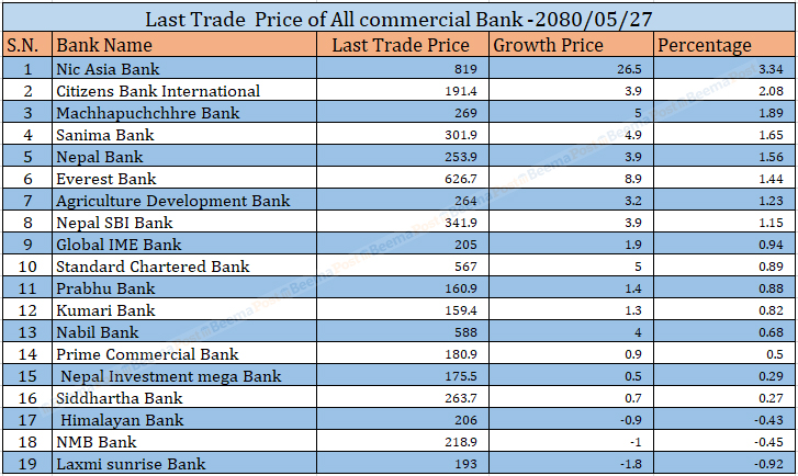 बुधबार बैंकिङ उपसूचकमा कारोबार भएका १९ वाणिज्य बैंकहरुमध्ये १६ वटा बैंकको शेयरमूल्य बढ्दा तीन बैंकको मात्र घटेको छ । वाणिज्य बैंकहरुको बुधबार भएको शेयर कारोबारको आधारमा एभरेष्ट बैंकलाई पछि पार्दै एनआईसी एशिया बैंक अग्रस्थानमा रहेको छ । बुधबार बैंकको शेयरमूल्य प्रतिकित्ता ८१९ रुपैयाँ रहेको नेप्सेले देखाएको छ ।