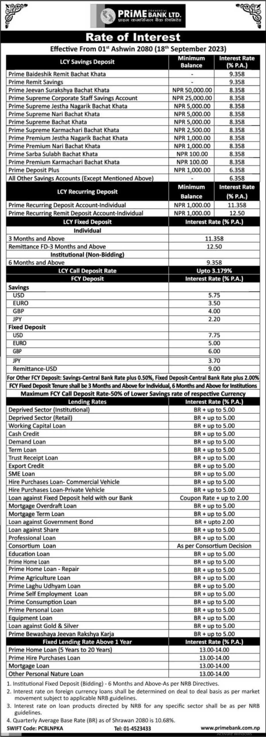 प्राइम कमर्सियल बैंकको नयाँ ब्याजदर सार्वजनिक, कुनमा कति ?