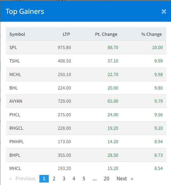 त्यस्तै, बलेफी हाइड्रोपावरको ९.८० प्रतिशत र अभियान लघुवित्तको ९.७९ प्रतिशत गरी कुल १८२ कम्पनीको शेयरमुल्य बढेको छ ।