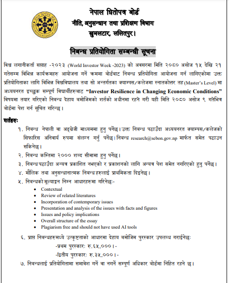 उक्त प्रतियोगितामा विभिन्न विश्वविद्यालय तथा सो अन्तर्गतका क्याम्पस तथा कलेजमा स्नातकोत्तर तहमा अध्ययनरत इच्छुक विद्यार्थीहरुले भाग लिन सक्नेछन् । सहभागीहरुले ‘Investor Resiliance In Changing Economic Conditions’ शिर्षकमा नेपाली वा अङ्ग्रेजी माध्यमबाट निबन्ध लेखी असोज ९ गतेभित्र बोर्डमा पेश गर्न सक्नेछन् ।