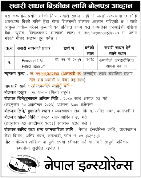 काठमाडौं । नेपाल इन्स्योरेन्स कम्पनी लिमिटेडले सवारी साधन बिक्रीका लागि बोलपत्र आह्वान गरेको छ ।