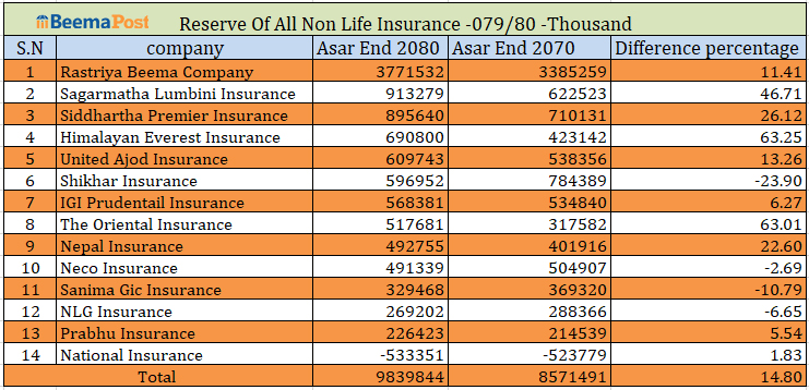 त्यस्तै, असार मसान्तसम्ममा ओरियन्टलको ५१ करोड रुपैयाँ, नेपाल इन्स्योरेन्स र नेको इन्स्योरेन्सको ४९ करोड रुपैयाँ, सानिमा जिआईसीको ३२ करोड रुपैयाँ, एनएलजी इन्स्योरेन्सको २६ करोड रुपैयाँ र नेशनल इन्स्योरेन्सको ५३ करोड रुपैयाँको जगेडा कोष रहेको छ ।