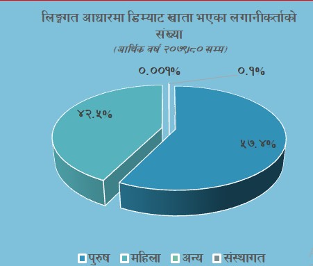 लिङ्गको आधारमा निकालिएको उक्त आँकडाले ०.१ प्रतिशत अन्य तथा ०.००१ प्रतिशत संस्थागत रुपमा लगानीक्षेत्रमा आवद्ध रहेको देखाएको छ ।