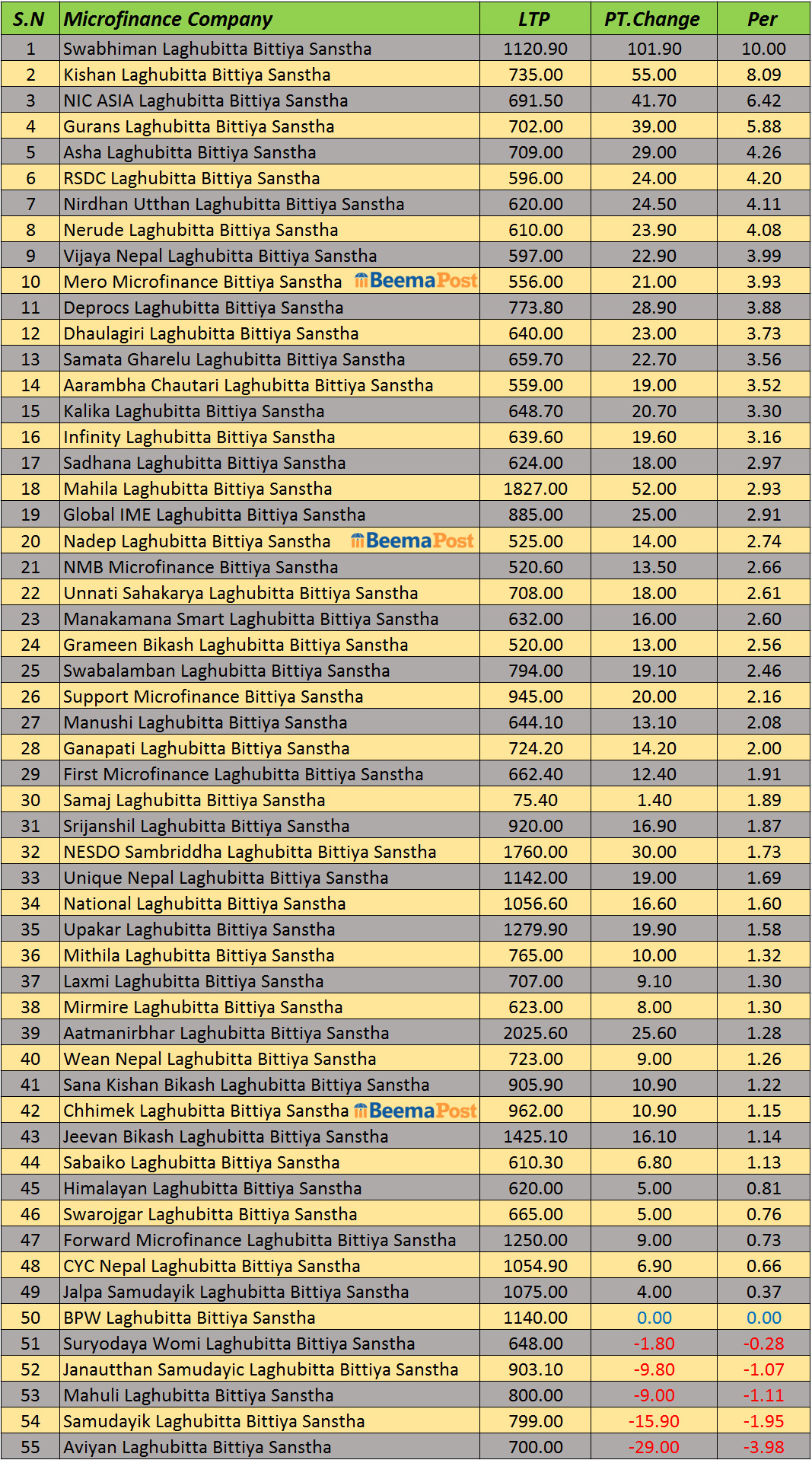 बिहीबार माइक्रोफाइनान्स सेक्टरबाट जम्मा ५५ कम्पनी कारोबारमा आएका थिए । जसमध्ये ४९ कम्पनीहरुको शेयरमूल्य बढ्यो भने ५ कम्पनीहरु अभियान लघुवित्त, सामुदायीक लघुवित्त, महुली लघुवित्त, जनउत्थान सामुदायीक लघुवित्त र सूर्याेदय वोमी लघुवित्तकको शेयरमूल्य क्रमशः सर्वाधिक प्रतिशतले घटेको छ । सोही दिन बीपीडब्लु लघुवित्तको शेयरमूल्यमा भने कुनै हलचल आएको छैन ।