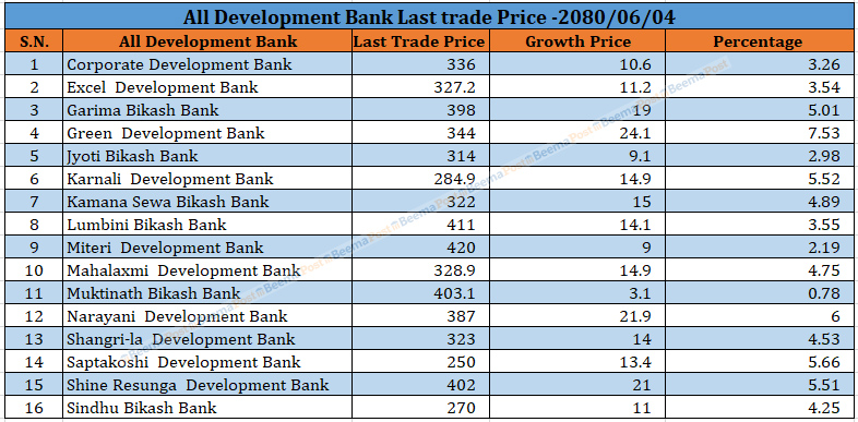 विकास बैंकहरुमध्ये सबैभन्दा धेरै शेयर मूल्य मितरी डेभलपमेन्ट बैंक, लुम्बिनी विकास बैंक, मुक्तिनाथ विकास बैंक, कामना सेवा विकास, सांग्रिला विकास, ज्योति विकास बैंक लगायतको शेयरमूल्य बढी रहेको छ ।