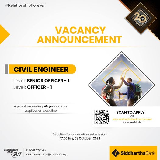 इच्छुक उम्मेदवारले असोज १६ गतेसम्म बैंकको भ्याकेन्सीमा उल्लेख गरिएको क्युआर स्क्यन गरी आधिकारीक वेबसाईट https://www.siddharthabank.com/career/ मार्फत आवेदन दिन सकिने बैंकले जनाएको छ ।