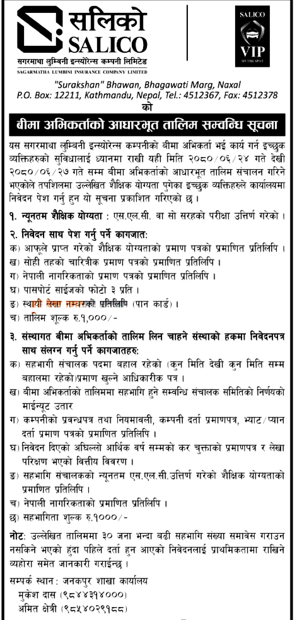 तालिम लिन योग्य एवम् इच्छुक व्यक्तिले आवश्यक कागजातसहित जनकपुर शाखा कार्यालयमा सम्पर्क राख्न सक्नेछन् ।