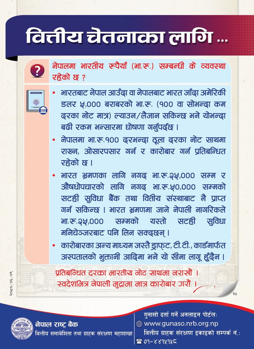 केन्द्रीय बैंकले भारतबाट नेपाल आउँदा वा नेपालबाट भारत जाँदा अमेरिकी डलर ५ हजार बराबरको भारतीय रुपैयाँ (१०० वा सो भन्दा कम दरका नोट मात्र) ल्याउन अथवा लैजान सकिने बैंकले प्रकाशित सूचनामा उल्लेख गरेको छ ।