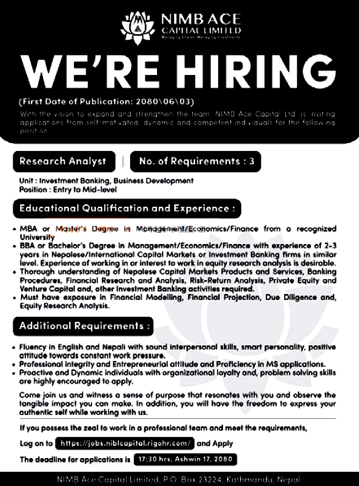 काठमाडौं । एनआईएमबि एस क्यापिटल लिमिटेडले रिसर्च एनालिस्टमा ३ जना कर्मचारी माग गरेको छ ।