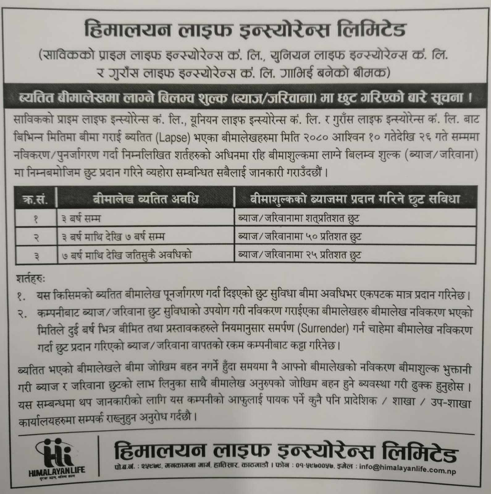 हिमालयन लाइफको व्यतित बीमालेख नवीकरण गर्दा विलम्ब शुल्कमा छुट