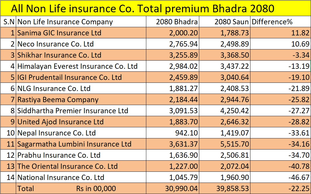 त्यस्तै, सबैभन्दा तल नेपाल इन्स्योरेन्स कम्पनी परेको छ । सो कम्पनीले जम्मा नौ करोड मात्रै व्यवसाय गरेको छ ।