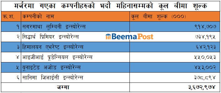 सगरमाथा र लुम्बिनी इन्स्योरेन्स मर्जर भई एक बनेको सगरमाथा लुम्बिनी इन्स्योरेन्स यस अवधिसम्ममा सबैभन्दा अग्रस्थानमा रहेको छ । कम्पनीले भदौ मसान्तसम्ममा ९१ करोड ४७ लाख रुपैयाँ बीमा व्यवसाय गर्न सफल भएको छ ।
