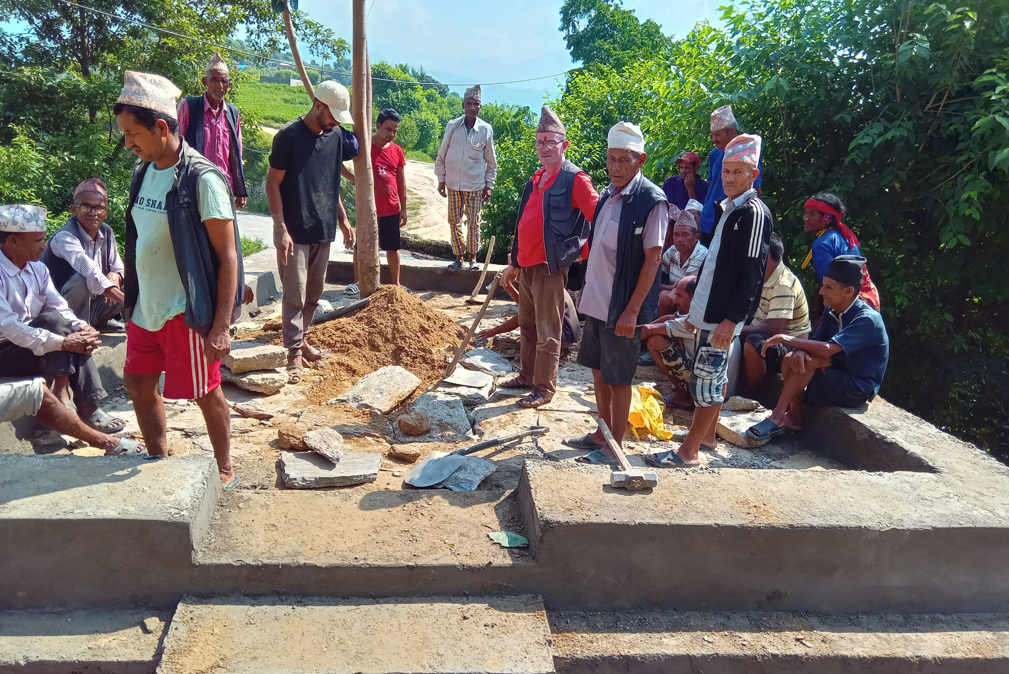 स्थानीय व्यक्ति तथा गाँउ समाजका विशिष्ट व्यक्तिहरुसँगको इच्छा तथा चाहाना अनुसार भदौ ७ गतेदेखि श्रमदान कार्य शुभारम्भ गरी भदौ १८ गते पिपल चौतारी निर्माण कार्य सम्पन गरी पुजाँ तथा विशेष पाठ गरी भदौ २५ गते समाजलाई हस्तान्तरण गरेको अध्यक्ष रावलले बताए ।