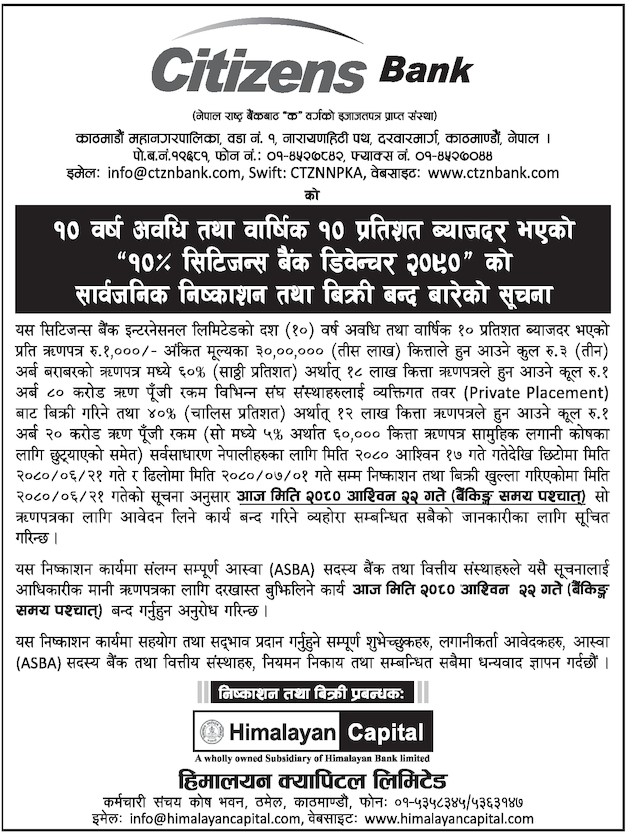 सिटिजन्स बैंकको ऋणपत्रमा आजसम्म आवेदन दिन सकिने