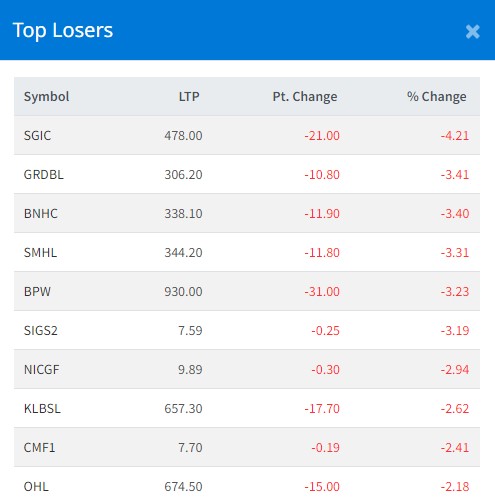 त्यस्तै, आज ग्रीन विकास बैंकको ३.४१, बुद्ध भूमि नेपाल हाइड्रोपावरको ३.४० प्रतिशतले घटेको छ । सुपर मादी हाइड्रोपावर, बीपीडब्लू लघुवित्त, सिद्धार्थ इन्भेष्टमेन्ट ग्रोथ स्किम २, एनआईसी एशिया ग्रोथ फण्ड, किसान लघुवित्त, सिटिजन्स म्युचुअल फण्ड १ र ओरेन्टल होटल्स लिमिटेडको शेयरमूल्य सर्वाधिक घटेको छ ।