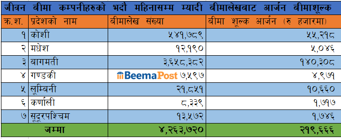 जीवन बीमा कम्पनीहरुले गरे म्यादी बीमालेखबाट पौने २२ करोड रुपैयाँ संकलन, कुन प्रदेशबाट कति ? (सूचीसहित)