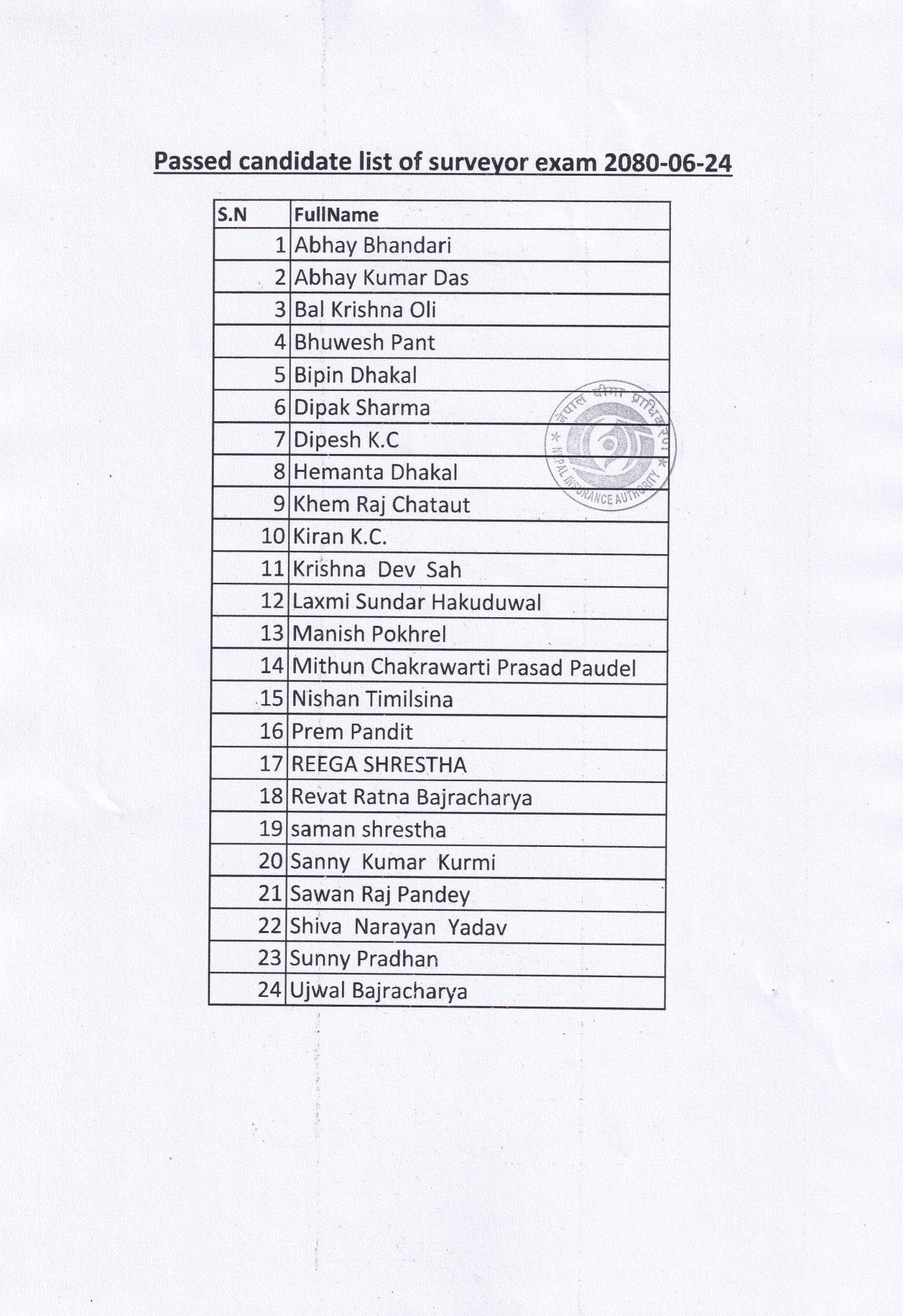 काठमाडौं । नेपाल बीमा प्राधिकरणले सर्भेयरको परीक्षा उत्तिर्ण गरेका २४ वटा उम्मेदवारको नामावली सार्वजनिक गरेको छ ।