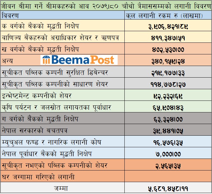 जीवन बीमा कम्पनीहरूले आव २०७९/८० को अन्त्यसम्ममा विभिन्न क्षेत्रमा ५ खर्ब ६८ अर्ब रुपैयाँ लगानी गरेका छन् ।प्राधिकरणका अनुसार जीवन बीमा कम्पनीहरूले आव २०७८/७९ को अन्त्यसम्ममा ४ खर्ब ७३ अर्ब रुपैयाँ लगानी गरेका थिए । आव २०७८/७९ को तुलनामा २०७९/८० मा जीवन बीमा कम्पनीहरूको लगानी २० प्रतिशतले बढेको हो ।