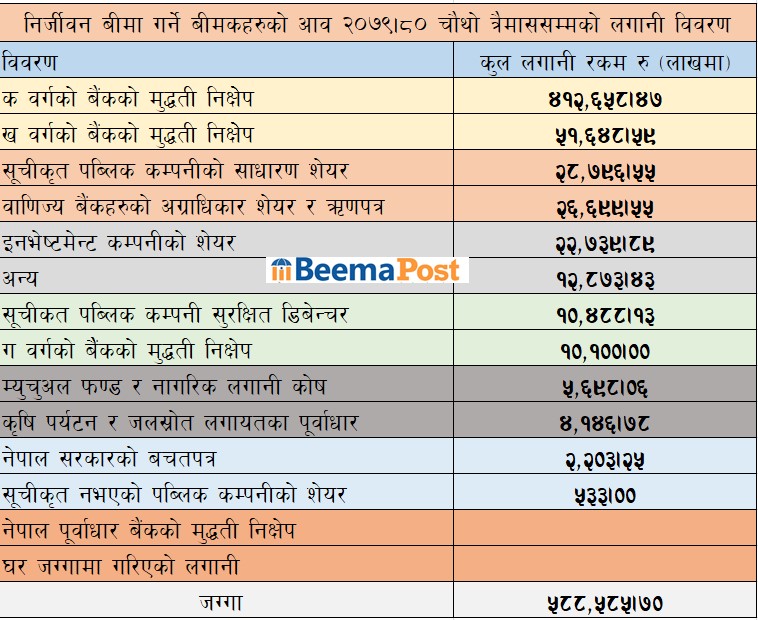 त्यस्तै, निर्जिवन बीमा कम्पनीहरुले सूचीकृत पब्लिक कम्पनीको साधारण शेयरमा २ अर्ब ८७ करोड रुपैयाँ, वाणिज्य बैंकहरुको अग्राधिकार शेयर र ऋणपत्रमा २ अर्ब ६६ करोड रुपैयाँ, इन्भेष्टमेन्ट कम्पनीको शेयरमा २ अर्ब २७ करोड रुपैयाँ, अन्य क्षेत्रमा १ अर्ब २८ करोड रुपैयाँ, सूचीकत पब्लिक कम्पनी सुरक्षित डिबेन्चरमा १ अर्ब ४ करोड रुपैयाँ, ग वर्गको बैैंकको मुद्धती निक्षेपमा १ अर्ब रुपैयाँ, म्युचुअल फण्ड र नागरिक लगानी कोष ५६ करोड ९८ लाख रुपैयाँ, कृषि पर्यटन र जलस्रोत लगायतका पूर्वधारमा ४१ करोड ४६ लाख रुपैयाँ, नेपाल सरकारको बचतपत्रमा २२ करोड रुपैयाँ, सूचीकृत नभएको पब्लिक कम्पनीको शेयरमा ५ करोड ३३ लाख रुपैयाँ लगानी गरेका छन् ।