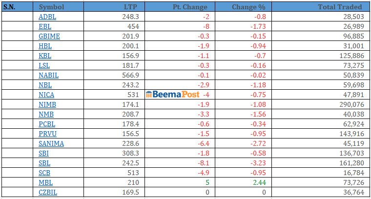 बैंकहरुमध्ये प्रभु बैंक, कुमारी बैंक, एनआइएमबि बैंक लगायतका वाणिज्य बैंकहरुको शेयरमूल्य सवैभन्दा कम रहेको छ ।