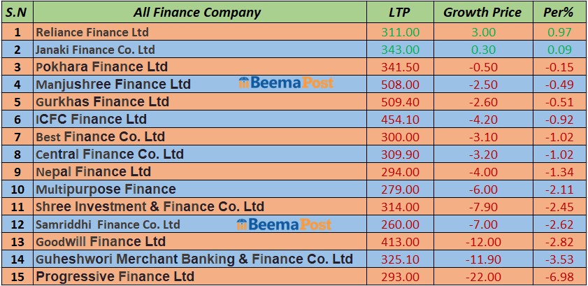 फाइनान्स कम्पनीहरुको शेयरमूल्यमा उच्च अंकको गिरावट, कुनको कतिले घट्यो ? (सूचीसहित)
