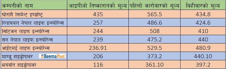 त्यसैगरी आईएमई लाइफ इन्स्योरेन्स कम्पनीले प्रिमियमसहित प्रतिकित्ता २३६।९१ रुपैयाँमा आईपीओ निष्काशन गरेको थियो  कम्पनीको पहिलो कारोबार प्रतिकित्ता ५२९।५० रुपैयाँमा भएकोमा बिहीवार भने कम्पनीको शेयर मूल्य ४८०।९० रुपैयाँमा झरेको छ ।