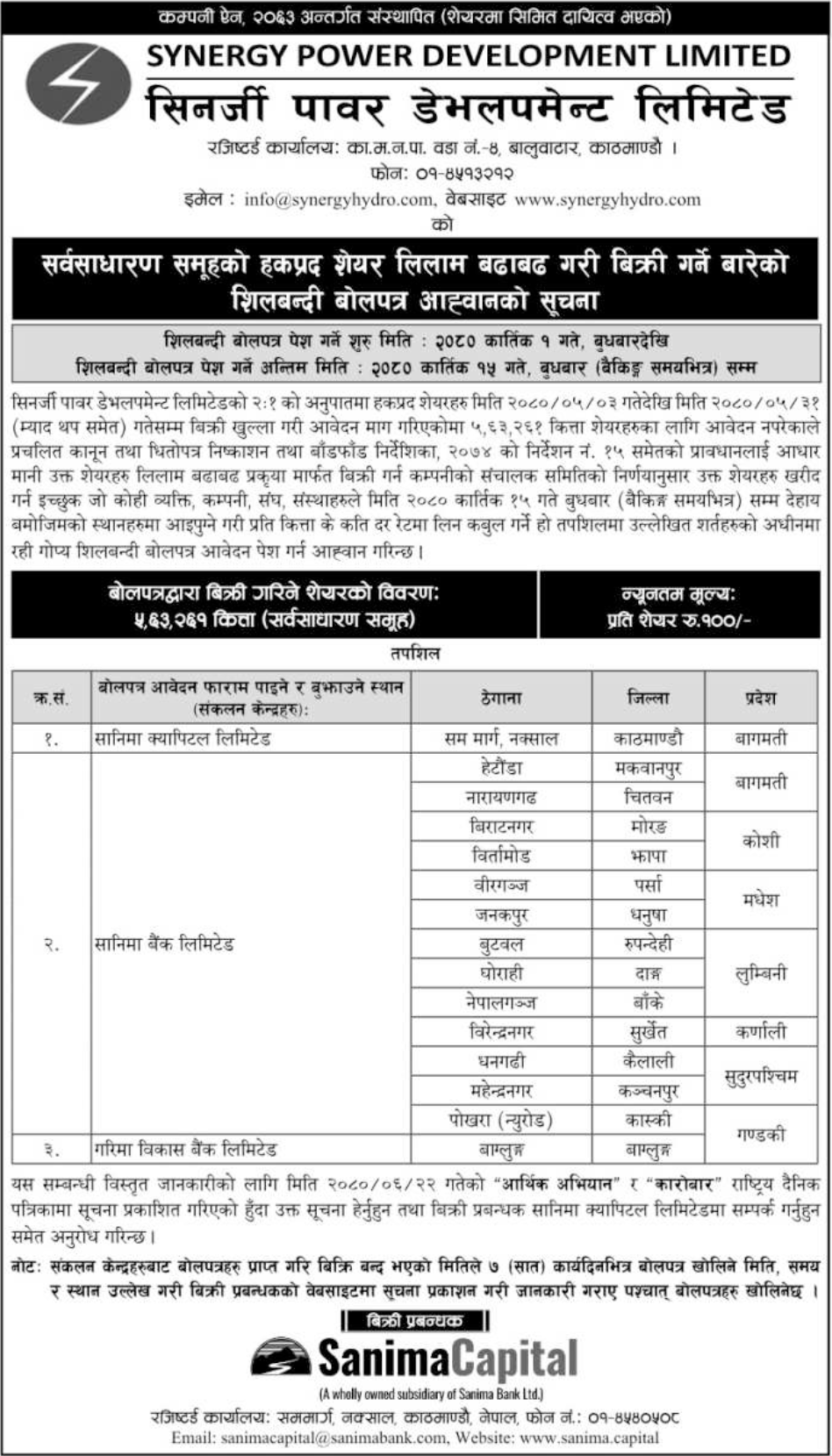 सिनर्जी पावरको अवितरित हकप्रद शेयर लिलामीमा आउने