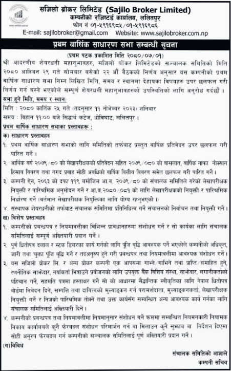 सजिलो ब्रोकरले डाक्यो प्रथम वार्षिक साधारण सभा, यस्ता छन् प्रस्तावहरुः