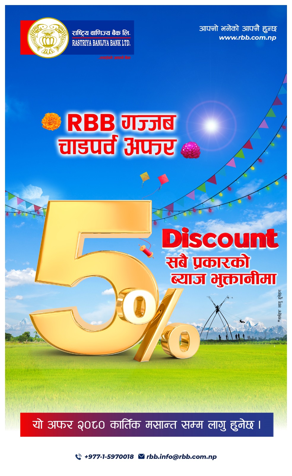 बैंकले एक सुचना जारी गर्दै नेपालीहरुको वडादशै तथा शुभ दिपावली, न्यु दया भिन्तुना र छव पर्वको उपलक्ष्यमा ब्याज भुक्तानी रकममा ५ प्रतिशत छुट दिने जनाएको हो । साथै, यो अफर २०८० कात्तिक मसान्तसम्म मात्र लागु हुुने बैंकले जनाएको छ ।
