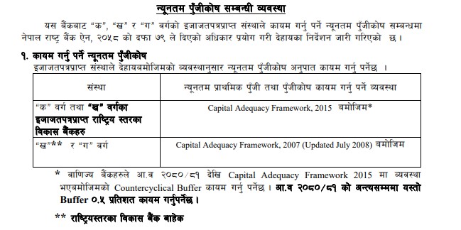 यसले बैंकहरुलाई व्यवसाय विस्तार गर्न थप पूँजीको आवश्यकता पर्छ । आर्थिक बर्ष २०८०र८१ को अन्त्यसम्ममा यस्तो बफर ०।५ प्रतिशत कायम गनुपर्ने भएको छ। राष्ट्रिय स्तरका विकास बैंक बाहेक यो व्यवस्था लागू हुने भएको छ।इजाजतपत्रप्राप्त संस्थाले पुँजीकोष सम्बन्धी निर्देशन पालना नगरेमा शीघ्र सुधारात्मक कारवाही सम्बन्धी विनियमावली, २०७४ बमोजिमको कारवाही हुने व्यवस्था गरिएको छ ।