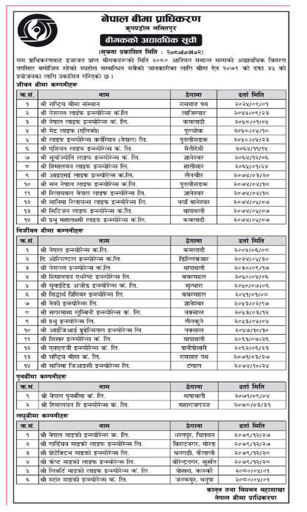 प्राधिकरणले प्रकाशित गरेको विवरण अनुसार २०२५ सालमा दर्ता भएको राष्ट्रिय बीमा संस्थानसहित १४ बीमा कम्पनी र २००४ सालमा दर्ता भएको नेपाल इन्स्योरेन्स कम्पनी लिमिटेडसहितका १४ निर्जीवन बीमा कम्पनी नविकरण भएका छन् ।