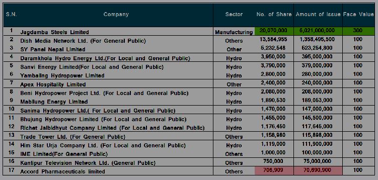 जगदम्बाले प्रतिकित्ता ३०० रुपैयाँका दरले ६ अर्ब २ करोड १० लाख रुपैयाँको आईपीओ बिक्री गर्न नेपाल धितोपत्र बोर्डसँग अनुमति मागेको छ । यस्तै, डिस मिडिया नेटवर्कले १ अर्ब ३५ करोड ८४ लाख रुपैयाँ बराबरको १ करोड ३५ लाख कित्ता शेयर निष्कासन गर्न धितोपत्र बोर्डसँग अनुमति मागेको छ । यी दुईबाहेक अन्य कम्पनीले एक अर्ब रुपैयाँभन्दा कमको आईपीओ निष्कासन गर्न अनुमति माग गरेका छन् ।