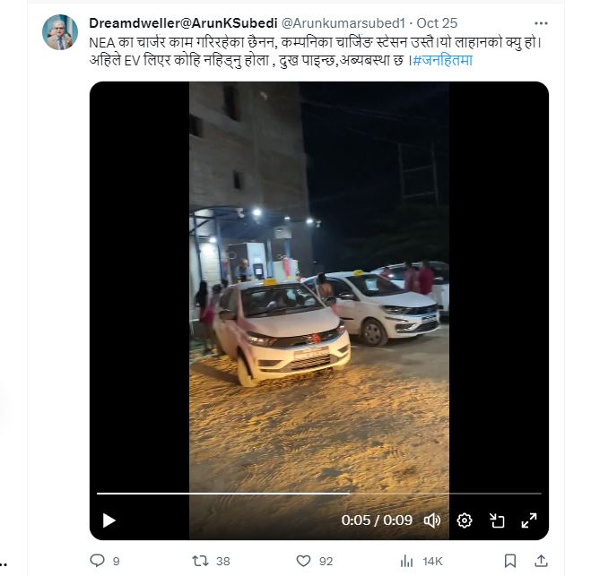 दुई दिन पहिले प्राध्यापक एवं विश्लेषक अरुण सुवेदीले सिराहको लहान पुगेर आफ्नो हैरानी साविकको ट्वीटर (हालको एक्स)मा पोखे । उनले एउटा भिडियो नै पोष्ट गरेर लेखे, ‘एनइएका चार्जर काम गरिरहेका छैनन् । कम्पनीका चार्जिङ स्टेशन उस्तै । यो लहानको क्यु हो । अहिले ईभी लिएर कोही नहिँड्नु होला, दुःख पाइन्छ । अव्यवस्था छ । ह्यासट्याग’जनहितमा ।’