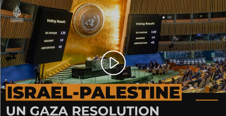 संयुक्त राष्ट्र संघीय महासभाको हिजोको बैठकमा इजरायल हमासबीचको युद्ध र गाजामा गरिएको हवाई आक्रमण तथा निर्दोषमाथिहरुको मरेको विषयमा गाजामा तत्काल भरपर्दो र दीगा मानविय युद्धविराम गर्नुपर्ने प्रस्ताव पेश गरिएको थियो । सो प्रस्तावमाथि भएको मतदानमा इजरायलको पक्षमा जम्मा १४ देशले मात्रै मतदान गरेका छन् भने विपक्षमा १२० देशले मतदान गरेका छन् । त्यस्तै, ४५ देशले मतदान नगरी तटस्थ बसेका छन् ।