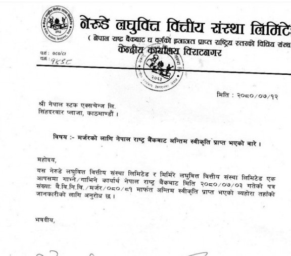 नेरुडे लघुवित्त र मिर्मिरे लघुवित्त वित्तीय संस्थाबीच मर्जरलाई लागि नेपाल राष्ट्र बैंकले अन्तिम स्वीकृति दिएको छ । यसअघि राष्ट्र बैंकले यो मर्जर प्रक्रियालाई सैद्धान्तिको थियो।
