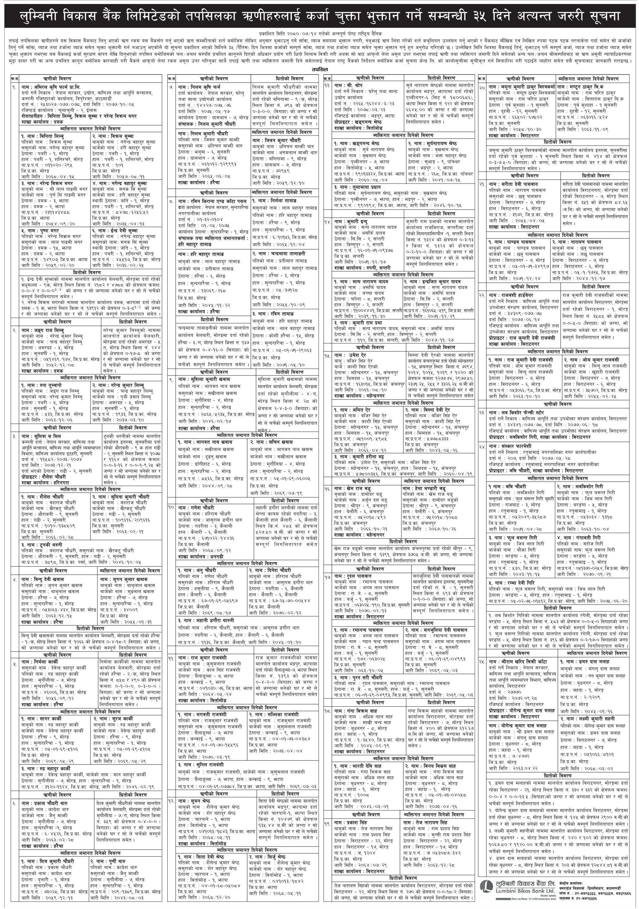 काठमाडौं । लिम्बिनी विकास बैंक लिमिटेडले उल्लेखित ऋणीहरुले ३५ दिनभित्र कर्जा चुक्ता नगरे धितो लिलाम गर्ने भएको छ ।