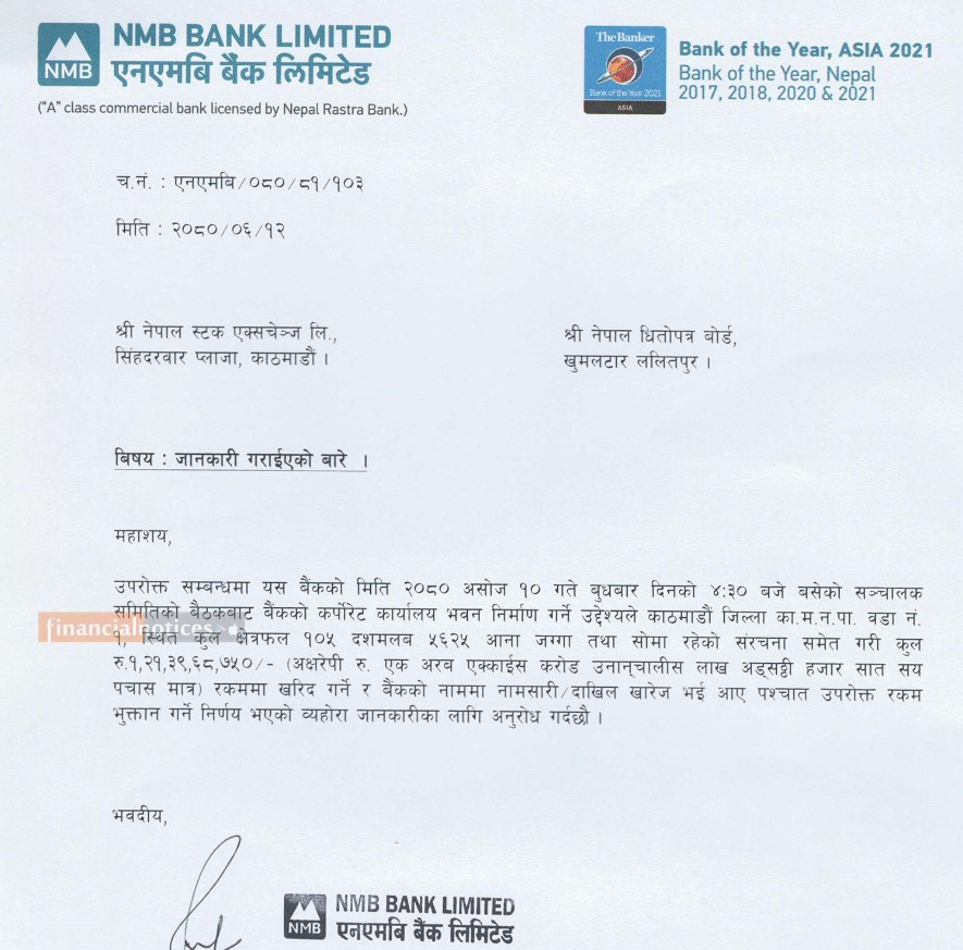 बैंकले काठमाण्डौ महानगरपालिका वडा नं। १ मा जग्गा खरिद गर्ने भएको हो । बैंकले १०५।५६२५ आना जग्गा तथा सोमा रहेको संरचनासमेत गरी कुल १ अर्ब २१ करोड ३९ लाख ६८ हजार ७५० रुपैयाँको खरिद गर्ने बिषय संचालक समितिले नै निर्णय गरेको जनाएको छ।